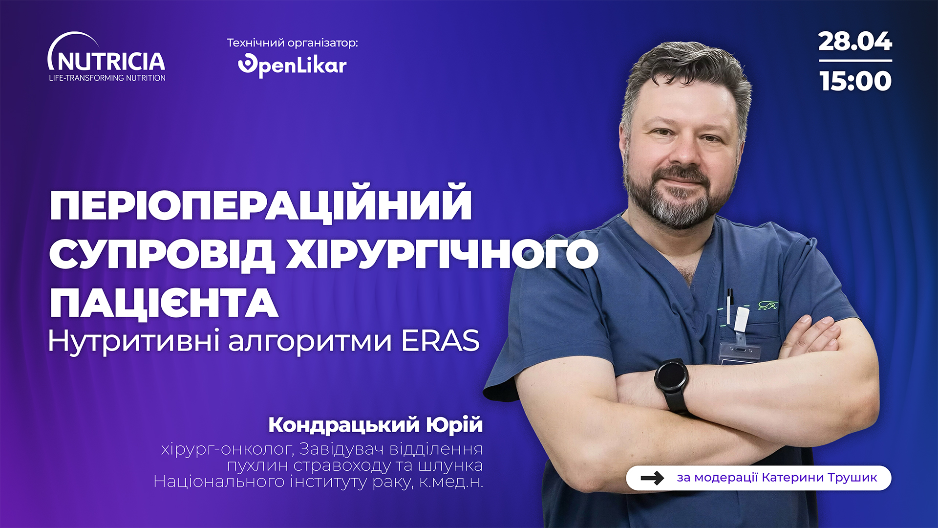 Запрошуємо долучитися до майстер-класу «Періопераційний супровід хірургічного пацієнта: нутритивні алгоритми ERAS», де разом із спікером Юрієм Миколайовичем Кондрацьким ми обговоримо: