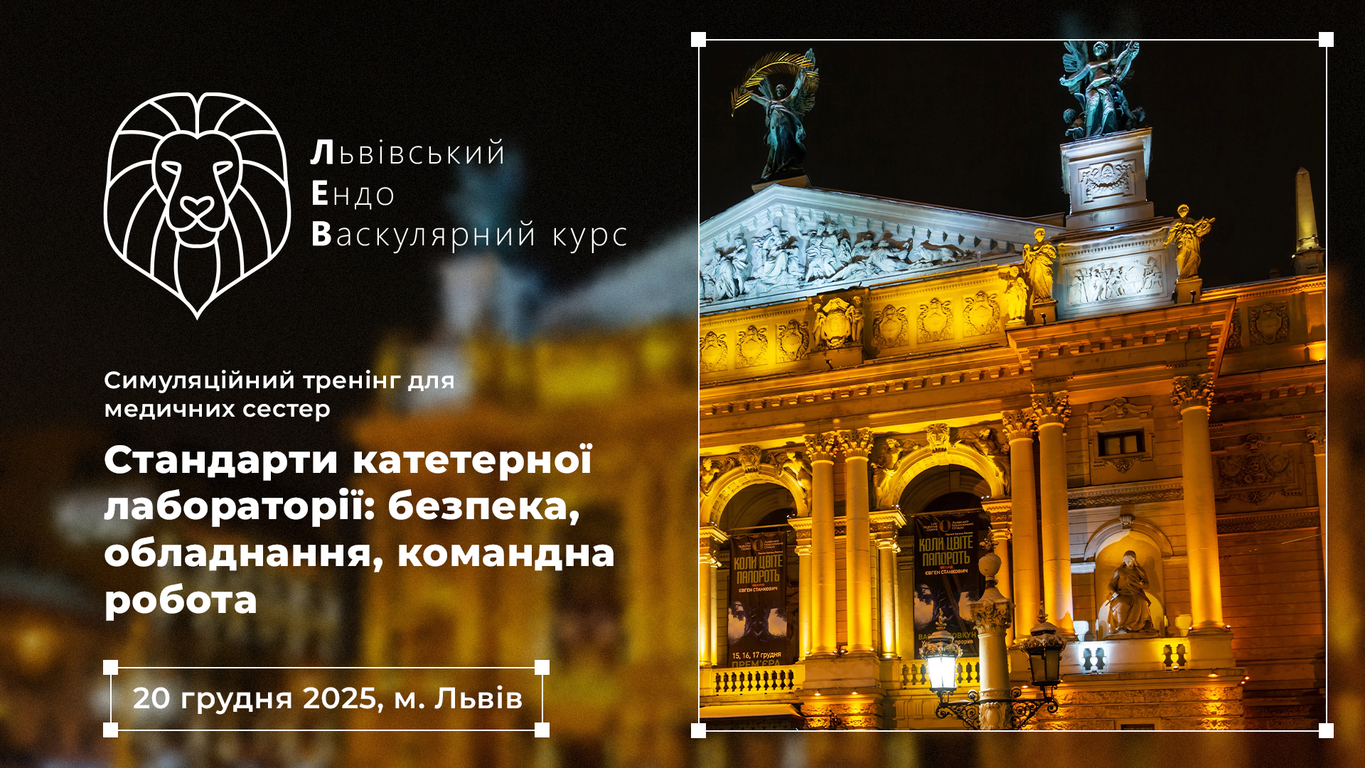 Запрошуємо вас взяти участь у Симуляційному тренінгу для медичних сестер «Стандарти катетерної лабораторії: безпека, обладнання, командна робота», який відбудеться 20 грудня 2025 року у рамках VIII Львівського ЕндоВаскулярного Курсу.